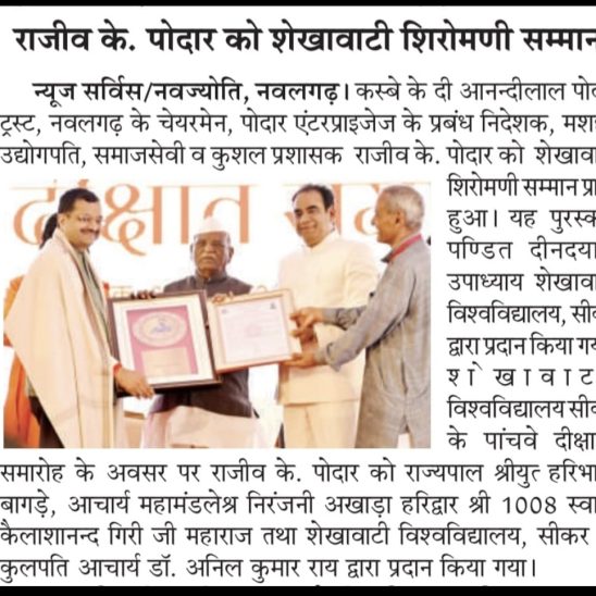 Mr. Rajiv Podar was felicitated with Shekhawati Shiromani Award at the hands of H.E. Haribahu Badge, Honourable Governor of Rajasthan at the event organised by the Pandit Deendayal Upadhyaya Shekhawati University (PDUSU), Sikar. He was invited as an Honoured Guest at the Fifth Convocation ceremony of the University.
