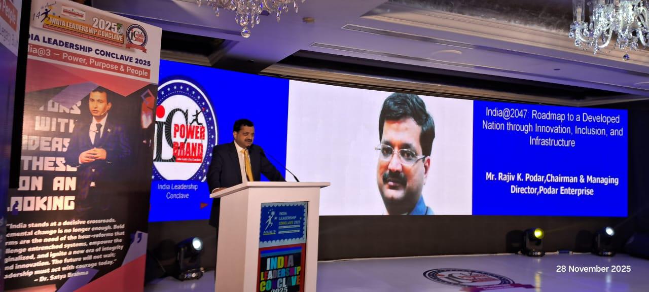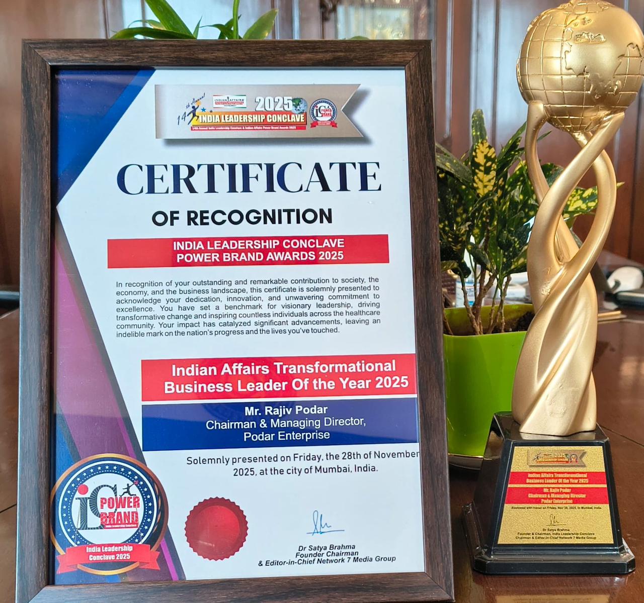 Mr. Rajiv Podar was honoured by the “Indian Affairs Transformational Business Leader of 2025” award at Indian Leadership Conclave Power Brands Award 2025. He was given the award  along with a  Certificate of Recognition by Dr. Satya Brahma, Founder Chairman and Editor-in-Chief Network 7 Media Group.