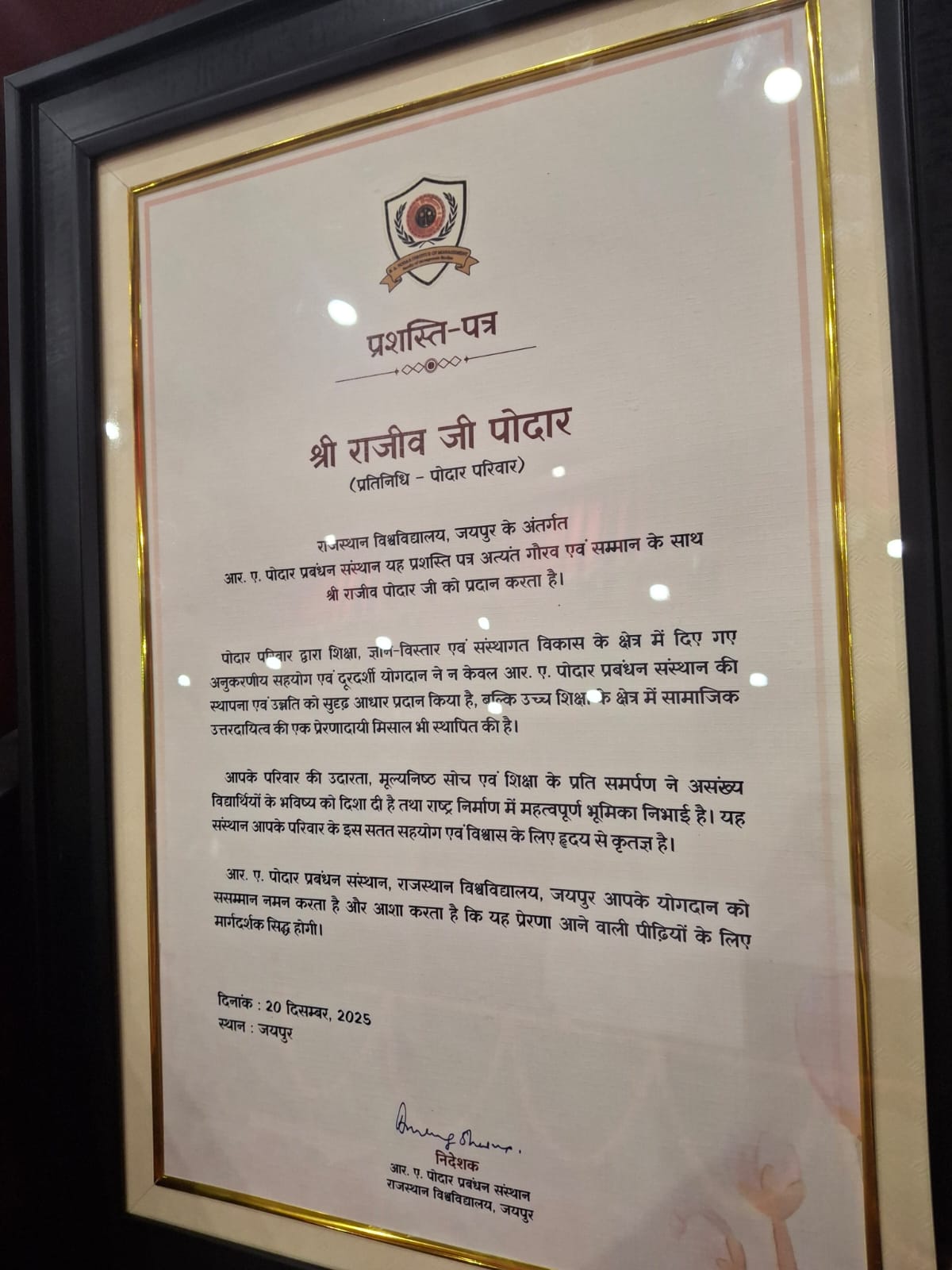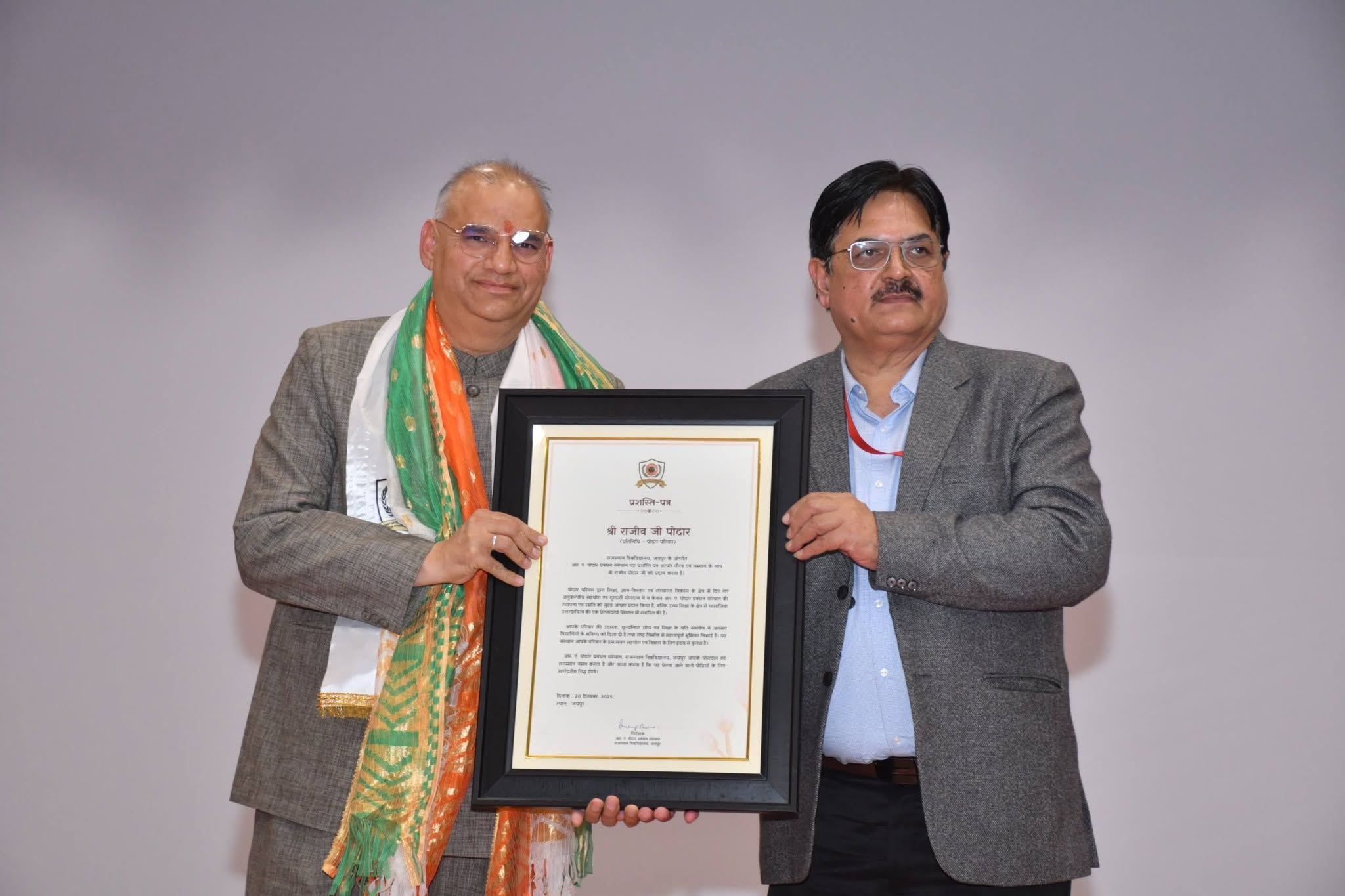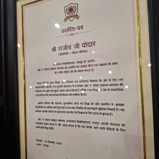 The certificate recognises and commends the Podar Family’s exemplary and sustained contributions to the field of education, the dissemination of knowledge, and institutional development in the state of Rajasthan.