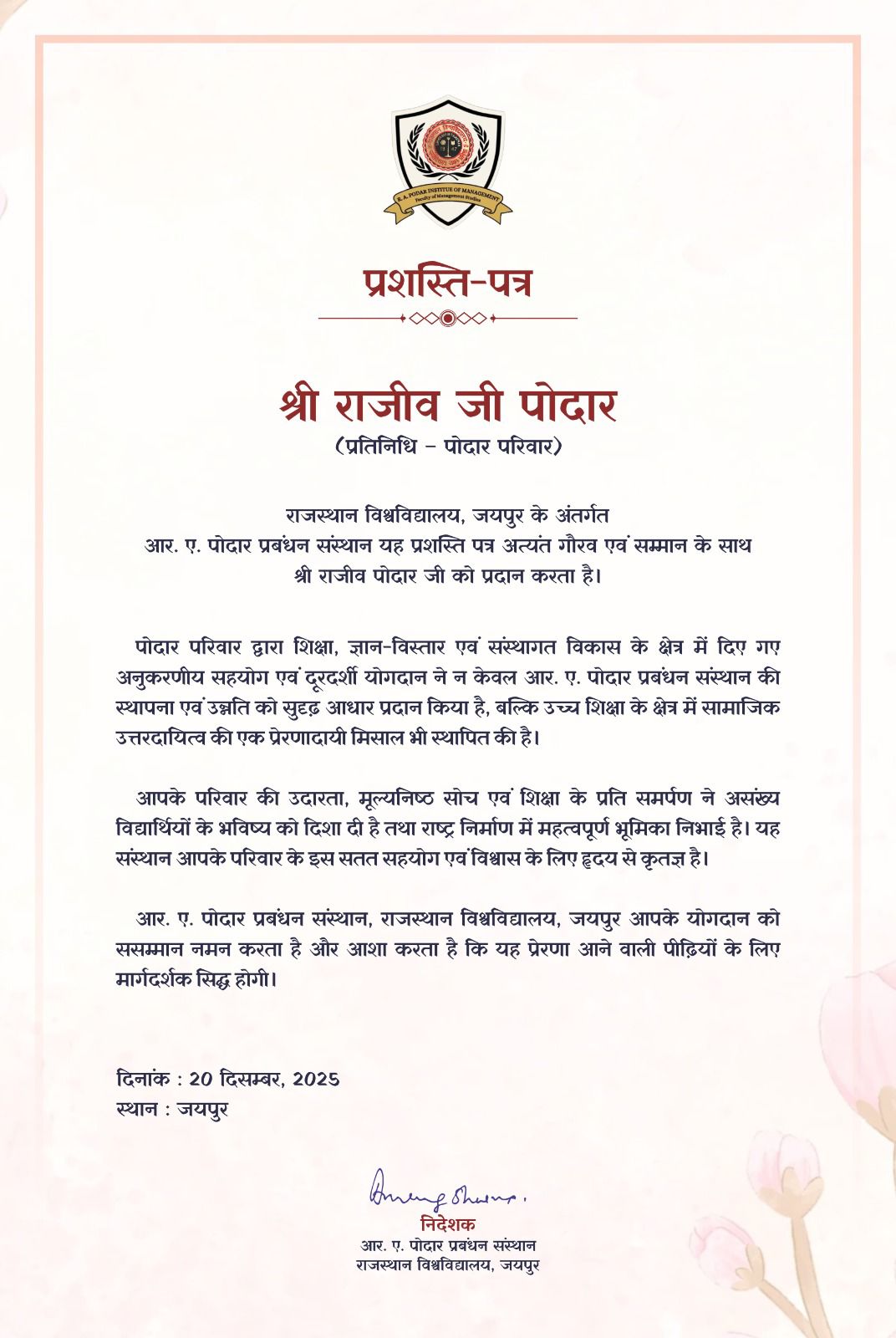On behalf of Podar Family, Mr. Rajiv Podar was conferred a Certificate of Appreciation by the R. A. Podar Management Institute Jaipur.